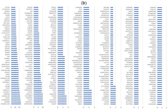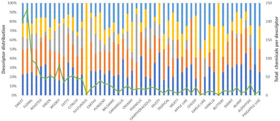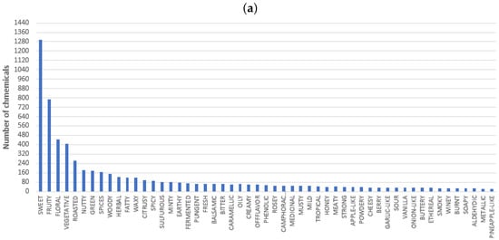 Regarding the obtained descriptors, Figure 2 depicts the distribution of 80% (53 descriptors) and 20% (350 descriptors) of the records. This figure shows that some of the most common descriptors include sweet, fruity, floral, vegetative, roasted, nutty, green, spices, woody, herbal, fatty, and waxy. On the contrary, some of the most uncommon descriptors include rubber, muscat, green pea, and leek, among others.