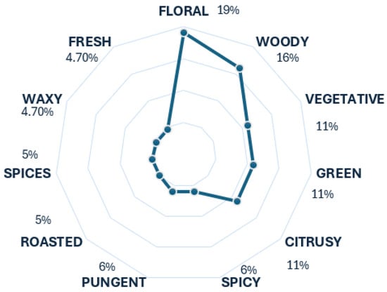 In the case of the gin, ten descriptors prevailed, with the woody descriptor being the most predominant, as illustrated in Figure 5. This tendency is correct, as the woody aroma classifies as a tier 1 descriptor for gin. Additionally, there is a slight tendency towards the descriptors floral and vegetative, which is accurate, considering these two aroma scents are also classified as tier 1 descriptors [18]. The lower tendencies observed for the remaining descriptors are correct, as they contribute to the aroma scent of gin to a lesser extent.