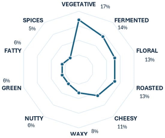 Baijiu is a typical Chinese spirit beverage made from sorghum. The results provided by the radar chart in Figure 8 show a tendency towards the descriptors vegetative and fermented. This tendency is accurate for the most part, as the fermented descriptor is usually considered a tier 1 element in baijiu aroma wheels [18,23], while vegetative per se is not. However, it can be related to the scent of herbal aroma, another of baijiu’s primary descriptors. The rest of the descriptors are accurate, as they complement the aroma of baijiu as lower tiers.