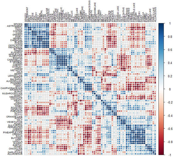 The correlation matrix presented in Figure 9 shows insightful relationships between the descriptors present in the database. The analysis revealed positive (blue), neutral (white), and negative (red) correlations, indicating the directions of associations between the variables. For instance, blue markers represent a strong positive relation between the variables, meaning that if one is strongly present in a beverage, the other would be too [24,25]. This correlation matrix was determined using the corr function in R. using a hierarchical clustering order.