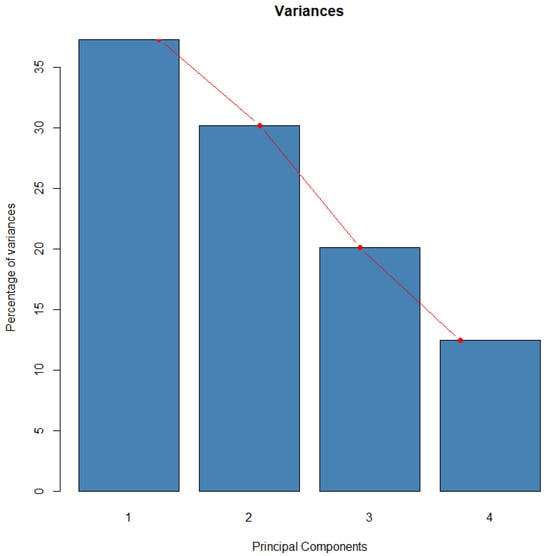 The inertia of the initial dimensions indicates the strength of relationships between variables and suggests how many dimensions should be examined. The first two dimensions account for 67.47% of the total dataset inertia, meaning that the plane captures this percentage of the total variability of individuals (or variables), as depicted in the scree plot in Figure 10.