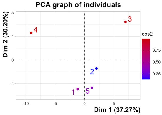 This relatively high percentage suggests that the first plane effectively represents the data variability. Furthermore, this value exceeds the reference threshold of 62.46%, indicating that the variability explained by this plane is significant. The reference value corresponds to the 0.95 quantile of the inertia percentage distribution, derived from simulating 1029 data tables of comparable size based on a normal distribution. This information was obtained using the FactoShinny package in R-Project.