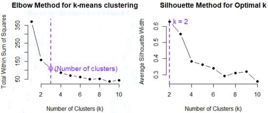 Elbow method (left) and Silhouette (right) method’s results using k-means clustering.