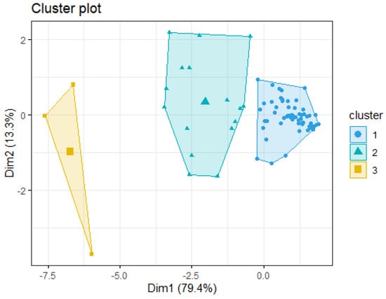 The application of the k-means algorithm revealed three clusters by the elbow method and two clusters by the Silhouette method (Figure 13). Considering three clusters, the first comprised 55 variables, the second included 16, and the third included 3. In the case where only two clusters are contemplated, the three points of the third cluster are joined to those in the second one. Table 4 presents the variables included in every cluster and Figure 14 depicts the clusters projected into their first two PCA components. Considering the distance between the second and third clusters, and given the fact that these components covered more than 92% of the variance, this configuration was chosen despite the suggested results from the Silhouette method. Cluster visualization is vital in understanding data’s underlying structure and relationships. By providing clear and intuitive representations of the clusters identified by clustering algorithms, these visualizations facilitate a deeper understanding of the data’s complexity and aid in further analysis and interpretation [29,30]. These clusters provide valuable insights into the underlying structure of the dataset, revealing inherent groupings that can inform further analysis and interpretation [29]. The distribution of variables across the clusters sheds light on the potential heterogeneity within the dataset. This distribution showed that clusters 1 and 2 have a stronger relationship because of the short distance in between. But, between clusters 2 and 1 and cluster 3 there is a clear distinction, indicating distinct differences in the patterns or characteristics of the variables of these clusters.