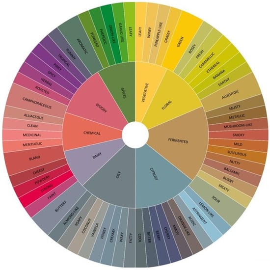 Regarding flavor wheels’ development from sensory descriptors, varied research is available. For instance, Calvert et al. [9] evaluated the flavor wheel of cider using word sorting under a sensory descriptive analysis of 40 sensory professionals and multivariate statistical techniques. Also, Hamilton and Lahne [10] proposed an automated sensory analysis using natural language processing from a descriptive lexicon from two websites about whisk(e)y using web scraping. Interestingly, flavor wheels have also been contemplated in non-distilled beverages. Some cases include the work of Wang et al. [11], who developed an aroma wheel of Oolong tea under different storage environments. Yu et al. [12] studied the profile description of human milk. In this work, twelve sensory evaluators formed a sensory panel for evaluation using a lexicon screening regarding aroma, flavor, and mouth feeling. As noted, flavor wheels have traditionally been constructed using sensory descriptors and usually not chemical compounds. Some exceptions include the work of Ramírez et al. [13], where a botanical compatibility assessment was implemented in gin production. This work focused on how sensory and chemical compounds can be used to develop a more robust and general flavor wheel from a machine learning perspective.