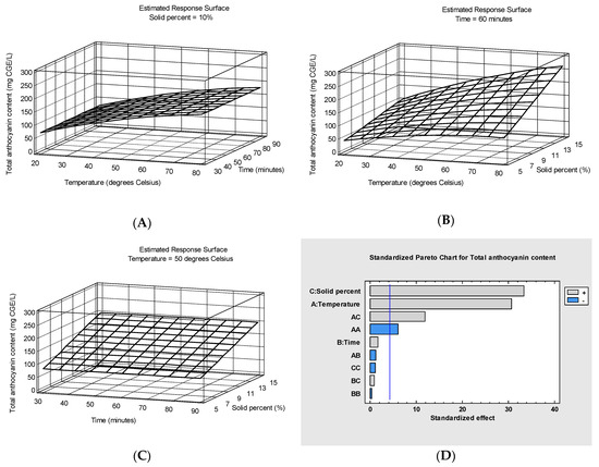 Response surface plots of total anthocyanin content (mg CGE/L) as a function of temperature and extraction time at 10% solid percent (A), temperature and solid percent at 60 min extraction time (B) and extraction time and solid percent at 50 degrees Celsius temperature (C) and Pareto chart for total anthocyanin content (D).
