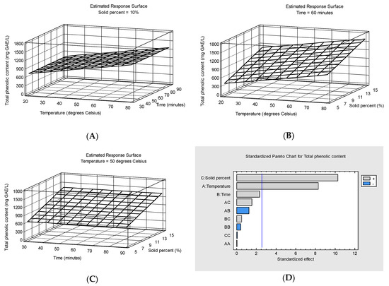 Figure 2A–C show the response surface plots of total phenolic content (mg GAE/L) as a function of temperature and extraction time at 10% solid percent (A), temperature and solid percent at 60 min extraction time (B) and extraction time and solid percent at 50 degrees Celsius temperature (C). The Pareto chart for total phenolic content shows that only solid percent and temperature have a significant impact on the response at the 95.0% confidence level. The variation obtained after excluding the insignificant effects (p-values higher than 0.05) is presented by means of the following equation: