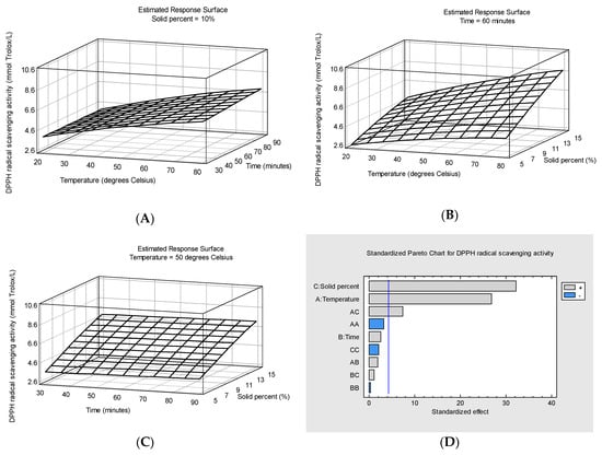 Response surface plots of DPPH radical scavenging activity (mmol Trolox/L) as a function of temperature and extraction time at 10% solid percent (A), temperature and solid percent at 60 min extraction time (B) and extraction time and solid percent at 50 degrees Celsius temperature (C) and Pareto chart for DPPH radical scavenging activity (D).