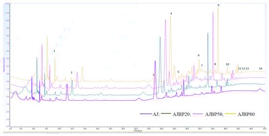 Representative HPLC-DAD chromatograms of phenolic compounds in apple juice (AJ) and in apple juices enriched with bioactive compounds through direct ultrasound-assisted extraction from bilberry pomace at 20 °C (AJBP20), 50 °C (AJBP50) and 80 °C (AJBP80) (λ = 280 nm; extraction time = 30 min, solid percent = 10%). Peak identification: (1) gallic acid; (2) epigallocatechin; (3) catechin; (4) chlorogenic acid; (5) caffeic acid; (6) hydroxybenzoic acid; (7) cyanidin 3-glucoside; (8) p-coumaric acid; (9) ellagic acid; (10) ferulic acid; (11) protocatechuic acid; (12) resveratrol; (13) quercetin; (14) kaempferol.