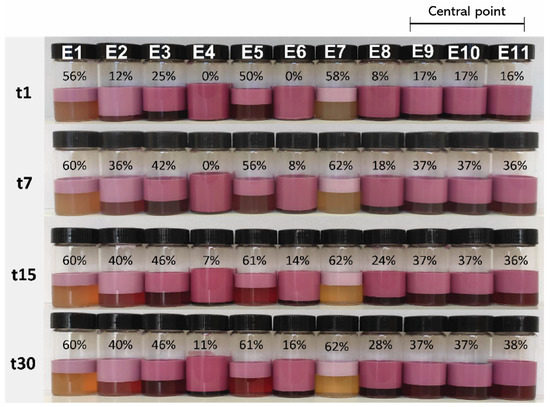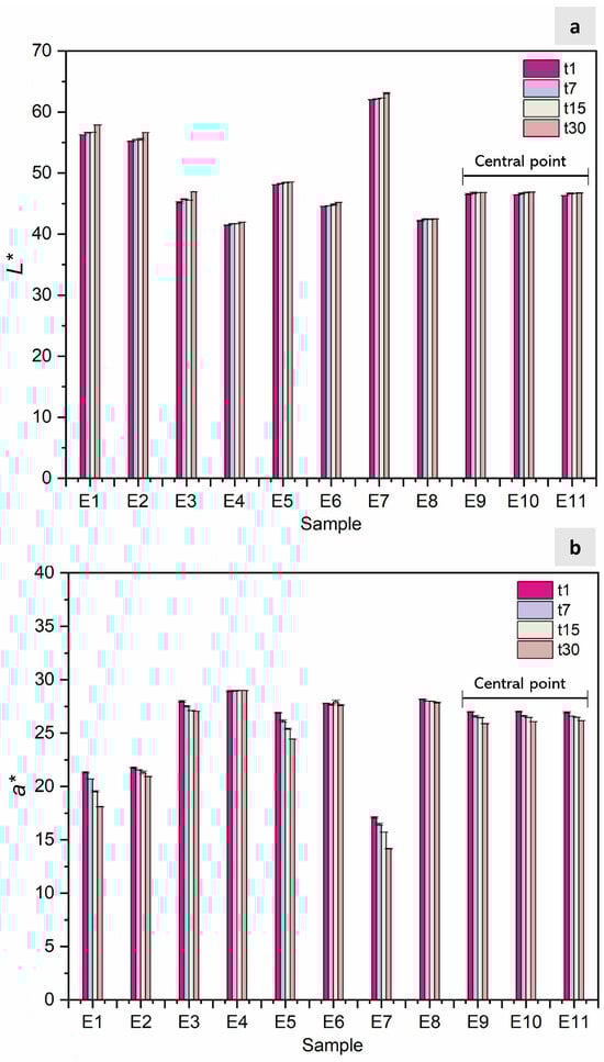 In Figure 3a,b, the color parameters L* and a* are depicted over the 30-day analysis period, with complete data available in Table S3 (Supplementary Materials). Table S3 includes the design matrix of the CCRD with independent variables (emulsion ratio (v/v) and colorant concentration (%)) and the colorimetric response (parameters a* and L*) for 1, 7, 15, and 30 days. Parameter a* consistently reached positive values, indicating samples with reddish tones. E7 (35/65/0.80) exhibited the lowest a* values and highest L* values throughout this study (t1: a* = 17.09 ± 0.06, L* = 62.01 ± 0.04; t30: a* = 14.17 ± 0.05, L* = 63.07 ± 0.13), indicating a lower colorant power, while E4 (46/54/10.37) was characterized by the highest a* values and lowest L* values (t1: a* = 28.92 ± 0.07, L* = 41.44 ± 0.05; t30: a* = 28.98 ± 0.01, L* = 41.95 ± 0.02), indicating higher colorant power with minimal changes over time. For E9, E10, and E11 (replicas of the central point), similar values were observed over time, with a CV varying from 0.15 to 0.54% for a* and between 0.1 and 0.2% for L*. Li and coworkers [23] observed in their (W1/O)/W2 system, which was used to entrap anthocyanins from Nicandra physalodes (Linn.) Gaertn. seeds that L* significantly increased (from 62 to 71) and a* decreased (from 15 to 9) over 28 days in a dark environment, indicating that the red color gradually faded. Similarly, Eisinaitė et al. (2020) [30] observed a significant loss of the red color (a* decreased from 21.83 ± 0.22 at time 0 to 17.02 ± 0.13 after 30 days), with L* values remaining relatively constant during the first 30 days (from 54.83 ± 0.54 to 56.22 ± 0.30). These results suggest that the studied system maintains a more consistent color over more extended periods.