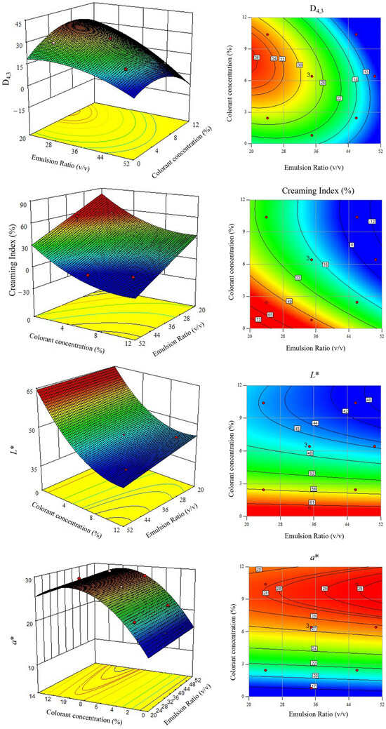 Response surfaces for the volume-mean droplet size (µm), the creaming index (%), and colorimetric parameters (L* and a*) as a function of colorant concentration (wt.%) and the emulsion ratio (v/v).