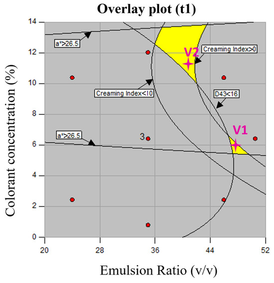 The overlay output for the initial time (t1) is shown in Figure 5. As can be inferred, two yellow color regions can be observed in the design space, corresponding to different optimal combinations of the two studied independent variables ((W1/O)/W2 ratio and colorant concentration) that fulfill the above-mentioned constraints. Thus, among the possible combinations, one optimal solution was used for each region, considering the main objective of obtaining an emulsion with a minimum D4,3 and CI. For the lower yellow optimal region, the following solution was graphically selected: a (W1/O)/W2 ratio of 48/52 and a colorant concentration of 6 wt.% (V1). For the upper yellow optimal region, the following conditions were chosen: a (W1/O)/W2 ratio of 41/59 and a colorant concentration of 11 wt.% (V2).