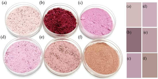 Average chroma variations presented a tendency toward less vivid colors in YSF and WTP, followed by YPP and YPF, in comparison with more saturated YSM and LYP. LYP was the most similar to purple sweet potato flour chroma (12.66 ± 0.08) and hue (58.7 ± 0. 2), but YPF was closer to its luminosity of 72.06 ± 0.03 and YPP to its 6.581 ± 0.002 a* red hue; however, all samples differed substantially from the 10.82 ± 0.09 b* coordinate []. Other sources of flours with similar tones like purple maize show higher lightness around 87.5, “redness” 5.82–6.53 a* values similar to YPP and YSF, but “yellowish” b* 25.96–26.53 []; while purple D. alata yams luminosity (68.69–79.36) was similar to YPF or YSF, a* was significantly lower (2.02–4.14), and b* (4.95–11.07) was similar to YPP’s value []. This suggests similar uses of these products to those of purple maize or Asian yams where YSM and LYP particularly may be useful in formulations with live, red-blue hues as red velvet cakes or purplish ingredients as berry-based products, while YSF or WTP powders may be desirable for the development of foods with more neutral colors. In fact, peels of fruits such as red dragon fruit (Hylocereus polyrhizus) have been pureed and incorporated successfully in potato donuts, a popular food in Jakarta, with success in sensory aspects []. Also, natural betalain pigments in beetroot peels have replaced artificial dyes in muffins, food industry ingredients that nowadays pose a health concern [], and, on the contrary, as dragon fruit peels in cookies, these natural pigments may add to the antioxidant capacity of foods, improving their nutritional value [].
