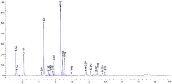 According to the report on the sugars in more than 40 plants, including roots, leaves, and other vegetable organs, myo-inositol concentration was lower than turmeric roots (0.1489 mg g−1), dandelion root (0.1243 mg g−1), carrot (0.8001 mg g−1), similar to parsley roots (0.0329 mg g−1) and higher than ginger roots (0.0087 mg g−1), and potato (0.0141 mg g−1), among different plants described []. The remaining sugars evaluated were lower than those of carrots, ginger, parsley roots, and dandelion roots. This may suggest an advantage for the fractions’ composition as they may constitute functional ingredients with a lower glycemic peak when consumed but increased bioactive potential by containing the aforementioned polyols that have been demonstrated to prevent mental health conditions and even metabolic syndrome [,].