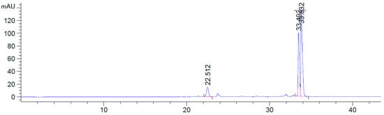 Among the identified anthocyanins (Figure 3), three predominant peaks (number 1, 7, and 9 in Table 3) were reported, which was consistent with results in D. trifida lyophilized samples []. These were further quantified through HPLC-DAD by interpolating with the peonidin standard curve (R2 = 1), which was also used for equivalent determination.
