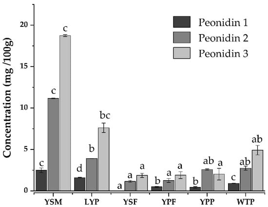As shown in Figure 4, lower amounts of peonidins were detected in YSF, YPF, and YPP (from 1.32 to 1.63 mg of “Peonidin 3” per 100 g of sample), intermediate values in WTP (4.92 ± 0.57 mg of “Peonidin 3” per 100 g of sample), and higher in YSM and LYP (up to 8.18 and 18.85 mg of “Peonidin 3” per 100 g of sample, respectively).