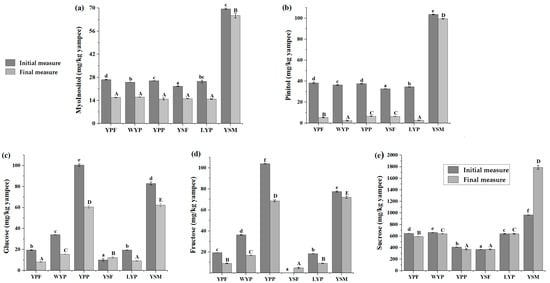 The evolution of sugars in time (day 43 -darker color- and 180 of storage) for each fraction depicted by individually quantified sugars (a) Myo-inositol, (b) Pinitol, (c) Glucose, (d) Fructose, (e) Sucrose. Concentrations of each measure are depicted as mean values with standard deviation error bars (n = 3). Means in a column followed by different lowercase letters (a–f) are significantly different at the 5% level at the initial time of measure. Means in the columns followed by different capital letters (A–E) are significantly different at the 5% level.