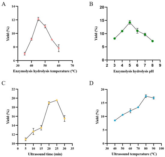 Effects of enzymolysis hydrolysis temperature (A), enzymolysis hydrolysis pH (B), ultrasound time (C) and ultrasound temperature (D) on the yield of TMP.
