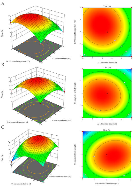 Response surface diagram and contour diagram of the interaction of ultrasonic time (A), ultrasonic temperature (B) and complex enzyme hydrolysis pH (C).