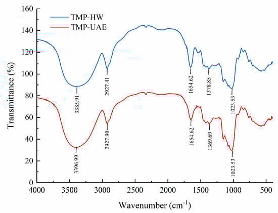Different extraction methods’ influence on the TMP structure was examined based on the responsiveness of FT-IR spectra to organic functional groups. As shown in Figure 4, both TMP-HW and TMP-UAE exhibited a broad and strong characteristic peak near 3400 cm−1, indicating the presence of O-H stretching vibration [32]. Additionally, the absorption peaks at 2927.41 cm−1 and 2927.90 cm−1 indicated the presence of asymmetric bending vibration of C-H bonds, which belong to the characteristic peaks of polysaccharides [33]. Spectral peaks at 1654.62 cm−1 were attributed to C-O stretching vibration in the carbonyl group [34]. The absorption peaks at 1378.85 cm−1 (TMP-UAE) and 1369.69 cm−1 (TMP-HW) represented C-H vibrations [35]. Furthermore, absorption peaks in the range of 1200–1000 cm−1 indicated the presence of pyranose structures [36]. These results suggested that the TMP extracted by UAE and HW had similar typical absorption peaks, indicating that UAE had no significant effect on the main chemical structure of polysaccharides and was an efficient and reliable extraction process.