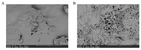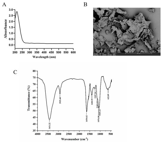 The UV scanning results of TMP are shown in Figure 8A, and there is no UV absorption peak at 260 nm and 280 nm wavelength, indicating that TMP does not contain proteins and nucleic acids. The SEM image of TMP is shown in Figure 8B. TMP presents loose lamellar structures clustered together with small pores of different sizes on its surface. It is reported that ultrasound-assisted extraction of polysaccharides from Flammulina velutipes exhibited a similar microstructure [44]. Furthermore, research indicates that porous and lamellar conformations can fully expose the active sites of polysaccharides and increase their specific surface area, which facilitates the utilization and absorption of polysaccharides, ultimately enhancing their antioxidant activity [42].