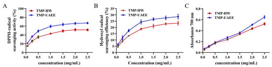 In vitro antioxidant activity of TMP obtained by different extraction methods. (A) DPPH radical scavenging activity; (B) hydroxyl radical scavenging activity; (C) ABTS radical scavenging activity. The concentrations of TMP-HW and TMP-UAEE were 0.625, 0.25, 0.5, 1.0, 1.5, 2.0 and 2.5 mg/mL. The data are presented as mean ± SD (n = 3).