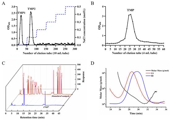 Isolation and purification of TMP. (A) The elution curve of TMP1 and TMP 2 on the DEAE-52 chromatography column. (B) Elution curve of TMP on Sephadex G-100 chromatography column. (C) TMP monosaccharide composition. (D) TMP average molecular weight.