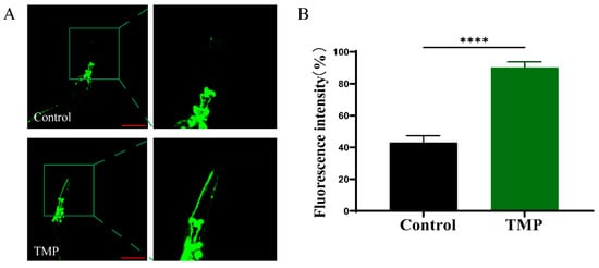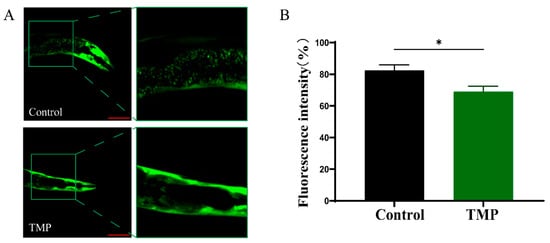 NL5901 C. elegans, which expresses human α-synuclein fused with green fluorescent protein, facilitated the direct observation of α-synuclein aggregation state [49]. Figure 9A,B demonstrated that NL5901 C. elegans exhibited significant fluorescence α-synuclein aggregation after 5 days, which markedly reduced upon TMP treatment, showing a 16.29% decrease in fluorescence intensity.