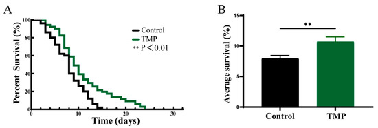 TMP extended the lifespan of NL5901 C. elegans. (A) Survival curves of NL5901 strains of C. elegans treated with and without TMP. (n = 50 for each group). (B) Comparison of the average lifespan of NL5901 C. elegans in the presence and absence of TMP. The mean survival day was assessed using the Kaplan–Meier method, and the log-rank test determined statistical significance to calculate the p value. The data are expressed as mean ± SD. p < 0.05 was statistically significant (** p < 0.01 compared to the Control group).