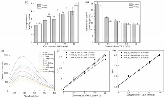 Effect of boiling treatment and OLA concentration on MP carbonyl content (a), total sulfhydryl content (b), and fluorescence intensity (c). Stern–Volmer curves of MP fluorescence quenching by OLA at different reaction temperatures: (d) un-boiled and (e) boiled for 5 min. Different capital letters (a–h) indicate a significant difference (p < 0.05) between the control and boiling samples at different OLA concentrations.