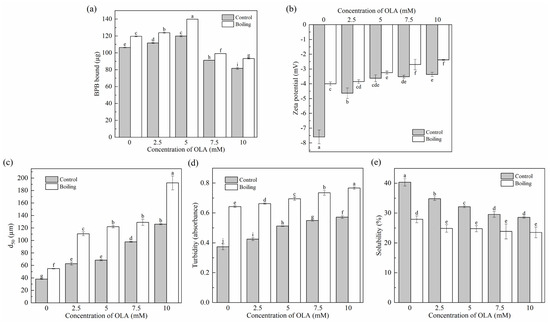 Effect of boiling treatment and OLA concentration on the surface hydrophobicity (a), zeta potential (b), particle size (c), turbidity (d), and solubility (e) of MP. Different capital letters (a–i) indicate a significant (p < 0.05) difference between the control and boiling samples at different OLA concentrations.