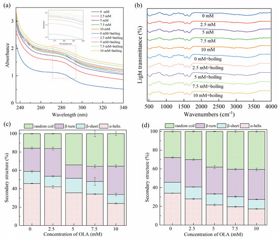 Effect of boiling treatment and OLA concentration on MP UV–visible absorption spectra (a), FTIR spectra (b), and secondary structure: (c) un-boiled and (d) boiled for 5 min.