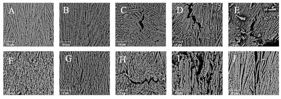 Effect of boiling treatment and OLA concentration on the microstructure of MP at 5000 magnification ((A,F): 0 mM, (B,G): 2.5 mM, (C,H): 5 mM, (D,I): 7.5 mM, (E,J): 10 mM. (A–E) was un-boiled; (F–J) was boiled for 5 min).
