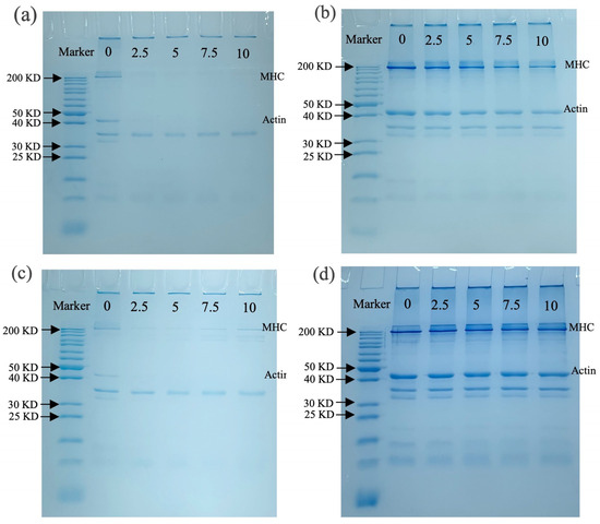 Figure 5c shows protein molecular weight changes with the boiling treatment without -ME; the MHC and actin bands of MP are lighter than those in Figure 5a. Under non-reductive conditions, more pronounced protein aggregation in the stacking gel was observed than in the un-boiled sample (Figure 5a), suggesting the boiling treatment enhanced MP cross-linking. A similar result was found by Chen et al. [64]. With -ME (Figure 5d), a large protein band recovery was seen, and the changes in MHC and actin bands are consistent with Figure 5b. The richer protein bands observed in Figure 5d than in Figure 5b might be associated with the boiling treatment accelerating MP oxidation by OLA, resulting in protein degradation or breakage [60].
