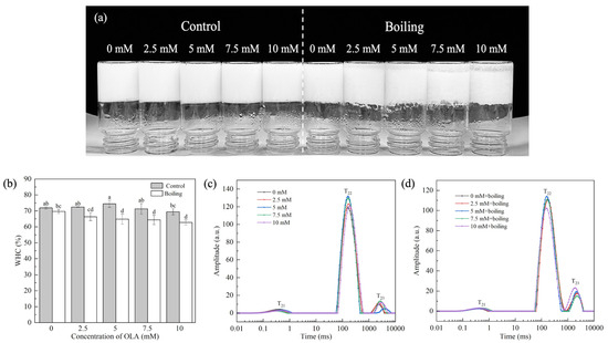 Effect of boiling treatment and OLA concentration on the macroscopic of MP gel (a). Effect of boiling treatment and OLA on MP gel WHC (b) and T2 relaxation time: (c) un-boiled and (d) boiled for 5 min. Different capital letters (a–d) indicate a significant difference (p < 0.05) between the control and boiling samples at different OLA concentrations.