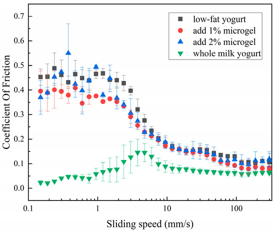 Oral tribology studies the friction behavior and lubrication characteristics between the interacting surfaces in the oral environment, which provides important information for understanding the interaction between food and oral surface [8,9,10]. Therefore, it has a certain application value for the evaluation of yogurt. We studied the effect of adding soybean fiber/sodium alginate microgel to different content levels on the oral friction coefficient and lubrication performance of low-fat yogurt. Figure 4 shows the change curve of the friction coefficient of the whole milk yogurt and the low-fat yogurt samples with different microgel content. We found that the friction coefficient of low-fat yogurt without soybean fiber/sodium alginate microgel was the largest. When it was between 0.1 and 5 mm/s, the friction coefficient of the two groups of samples with different concentrations of soybean fiber/sodium alginate microgel was smaller than that of low-fat yogurt but larger than that of whole milk yogurt. This improvement may be attributed to the lubrication film formed by the microgel in the mouth, which reduces the friction between the microgel and the surface of the mouth [38], thus providing a taste closer to whole milk yogurt, which can mainly be attributed to a “ball bearing” effect [39]. However, an excess of microgels could lead to their jamming and compression, which inhibits the rolling motion of the microgels, thereby increasing the friction. Similar observations have been reported for gelatin microgels [40] and whey protein–xanthan gum microgels [41]. This part of the results proved that soybean fiber/sodium alginate microgel had a positive effect on the oral lubrication performance of low-fat yogurt.
