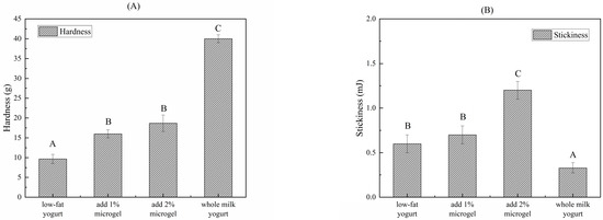 Texture of low-fat yogurt with different microgel concentrations. (A) Hardness and (B) stickiness. Bars within one attribute with different letters denote a statistically significant difference (p < 0.05).
