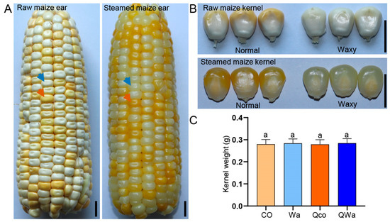 Comparison of characteristics of waxy and normal maize kernels before and after steaming. (A) Raw/steamed normal (yellow) and waxy (white) maize kernels from ear 25 days after pollination. Scale bars: 1 cm. Helps observe initial color differences before/after steaming. Blue arrow: waxy corn kernels. Red arrow: normal corn kernels. (B) Individual fresh/steamed normal and waxy maize kernels. Scale bars: 1 cm. Picture clearly shows visual transformation from raw to steamed state. (C) Weight change in individual waxy and normal maize kernels before and after steaming. “a” indicates no significant differences (>0.05) by Duncan’s test. n = 20. CO, fresh normal maize kernels (labeled as control, CO); Wa, fresh waxy maize kernels; Qco, steamed normal maize kernels with respect to kernel quality; Qwa, steamed waxy maize kernels.