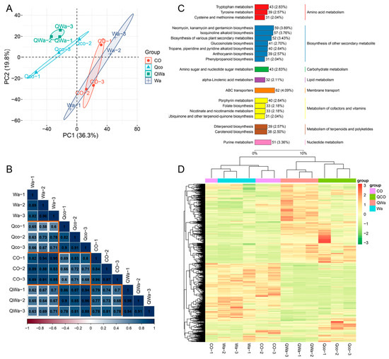 Global analysis of detected metabolites in waxy and normal maize kernels. (A) Principal component analysis (PCA) of metabolites in raw normal maize kernels (CO), raw waxy maize kernels (Wa), steamed normal maize kernels (Qco), and steamed waxy maize kernels (QWa). Axes show components and contribution, with points for samples (same group in same color). The dash line indicates the position of zero. (B) Correlation plot of metabolites in CO, Wa, Qco, and QWa. Vertical axis for sample names, color for r magnitude, replicates with strong positive correlation for data reproducibility. (C) Use top 20 KEGG KO pathway level 3 entries to display 4043 metabolites’ classification. Box items denote KEGG pathway annotations, column length shows metabolite numbers in pathways, parentheses figures show proportion. (D) Clustering heatmap of 1246 common single differential metabolites (filtered by fold change ≥ 1, VIP ≥ 1, p-value ≤ 0.05) in CO, Wa, Qco, and QWa.
