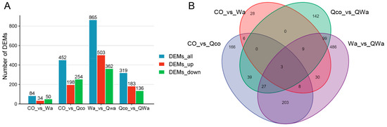 Identification and comparative analysis of differential metabolites in waxy and normal maize kernels pre-/post-steaming. (A) Screened all metabolites pairwise by fold change ≥ 1, VIP ≥ 1, p-value ≤ 0.05. (B) Venn diagram shows common single metabolites in CO_vs_Wa, CO_vs_Qco, Wa_vs_QWa, Qco_vs_QWa groups; overlapping part and numbers mark common metabolites and their quantity. CO, fresh normal maize kernels; Wa, fresh waxy maize kernels; Qco, steamed normal maize kernels; Qwa, steamed waxy maize kernels; DEM, differential metabolites; vs, versus; DEMs_all, all the DEMs in an analytical group; DEMs_up, up-regulated DEMs; DEMs_down, down-regulated DEMs.