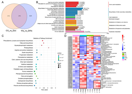 To analyze the effect of steaming on metabolites within waxy and normal maize kernels, we investigated the common and differential metabolites in normal maize kernels both before and after steaming (CO_vs_Qco), as well as those in waxy maize kernels before and after steaming (Wa_vs_QWa). The Venn diagram demonstrated that there were 1076 differential metabolites in total for CO_vs_Qco and Wa_vs_QWa. Among these, 241 were identical DEMs, accounting for 22.40% (Figure 4A). There were 211 unique metabolites in CO_vs_Qco and 624 in Wa_vs_QWa. Compared to normal maize kernels, waxy maize kernels had a greater number of unique differential metabolites before and after steaming.
