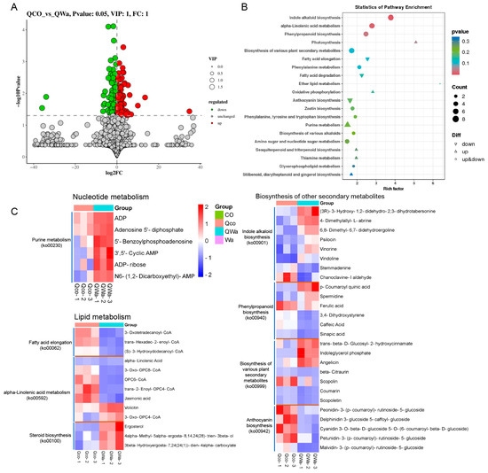 Differential metabolite profiles in steamed waxy and normal maize kernels. (A) The comparison of the number of differential metabolites (DEMs) in steamed waxy and normal maize kernels. (B) KEGG enrichment pathways of the metabolites between the Qco_vs_QWa. (C) Depicts the differences in metabolite abundances in specific metabolic pathways between the waxy and normal kernels after steaming. CO, fresh normal maize kernels; Wa, fresh waxy maize kernels; Qco, steamed normal maize kernels; Qwa, steamed waxy maize kernels; vs, versus.