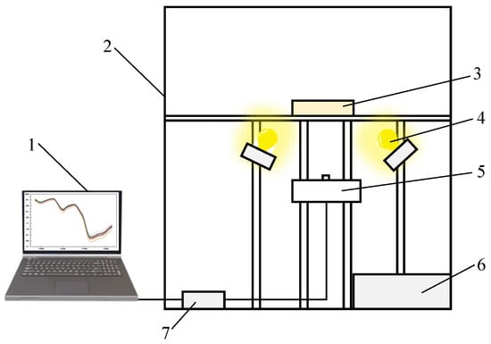 Protein content detection platform based on near-infrared spectroscopy. 1. Computer; 2. camera obscura; 3. corn kernel powder sample; 4. illuminant; 5. optical fiber; 6. power source; 7. spectrograph.