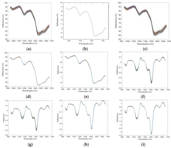 Since the detection platform is a relatively open spectroscopic detection system, during the collection of sample spectral information, the corn powder’s spectral information is captured, along with some random noise, stray light, electrical noise, and other unrelated external information []. Therefore, it is essential to apply appropriate spectral preprocessing algorithms to process the raw spectra before conducting spectral data analysis.