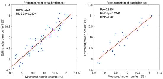 Additionally, by comparing the evaluation metrics further, the optimal modeling algorithm was determined by comparing the evaluation indexes (R, RMSE and RPD) values of the rbf-SVM and ELM models. The results indicated that the ELM model developed a better performance than the rbf-SVR model. Therefore, compared to the other algorithms, the PLSR model produced satisfactory results in predicting protein content, especially after first-derivative processing, which yielded the optimal predictive model (good prediction accuracy). Specifically, the preprocessing methods—1D + MSC and 1D + SNV—achieved commendable results. Under the preprocessing conditions of 1D + MSC and 1D + SNV, the evaluation metrics for the PLSR prediction model were as follows: Rp: 0.92, RMSEp: 0.3, RPD: 3 (1D + MSC); and Rp: 0.92, RMSEp: 0.3, RPD: 3 (1D + SNV).