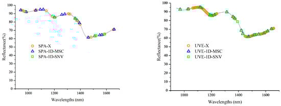 Common spectral preprocessing algorithms include standard normal variate transformation (SNV), derivatives, smoothing, multiplicative scatter correction (MSC), and baseline correction [,]. In this study, based on the powdered nature of corn powder and the volume of spectral data, six different algorithms were selected as preprocessing methods: Savitzky-Golay (S-G) convolution smoothing, multiplicative scatter correction (MSC), standard normal variate transformation (SNV), the first derivative (1D), the first derivative combined with S-G smoothing (1D + SG), the first derivative combined with multiplicative scatter correction (1D + MSC), and the first derivative combined with standard normal variate transformation (1D + SNV).