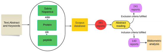 Reports from the Scopus database were searched using the terms “Salvia hispanica” and “protein” or “peptide” in the article text, abstract, and keywords. Documents mentioning any chia protein derivative for food application, in any year of publication, were selected. Reports mentioning other non-food applications or those not involving chia proteins or peptides were excluded from the search. The Scopus database was chosen for its extensive collection of publications across various fields and wide-ranging coverage of the literature. The selected report data were exported from the database and inserted into the Vosviewer® software (1.6.19). After searching for reports in the Scopus database, 381 documents were retrieved, including review articles, book chapters, and conference proceedings. A total of 140 reports were selected after applying inclusion and exclusion criteria. Figure 1 summarizes the search methodology in the Scopus database.