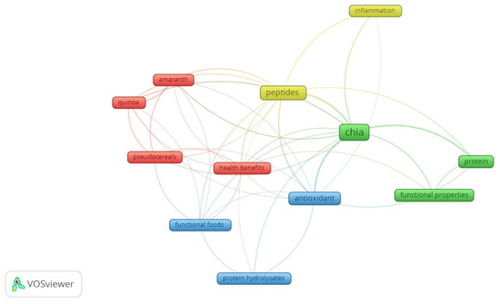 Firstly, keyword analysis was used to determine the words most used by authors. The network co-occurrence visualization (Figure 2) shows the presence of four clusters. Cluster 1 includes amaranth, health benefits, pseudocereals, and quinoa. Cluster 2 includes the following keywords: chia, functional properties, and protein. Cluster 3 is composed of antioxidant, functional properties, and protein hydrolysates. Cluster 4 contains the following words: inflammation and peptides.