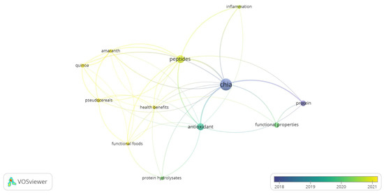 In addition, as shown in Figure 3, the research on health benefits, functional foods, inflammation, and peptides is more recent than that on chia and protein research. As peptides are produced from proteins or chia flour, research concerning the entire chia seed and the protein component should be previously realized. The recent use of peptides and functional foods keywords (Figure 3) denotes their greater frequency in reports and therefore evidences their research interest and future trending theme. The overlay distribution of the other keywords that are dated between 2018 and 2021 are also current keywords.