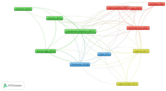 Networks of co-cited references are shown in Figure 4, for which a total of 12 co-cited documents were arranged into four clusters. The most co-cited report [15] had 26 citations. It is one of the first to demonstrate chia protein isolation, especially globulins and albumins [15], and therefore it is a fundamental one in the research of proteins and peptides from chia. The second most cited reports [16] had a total of 11 citations, and it approaches chia seed features and the extraction of mucilage.